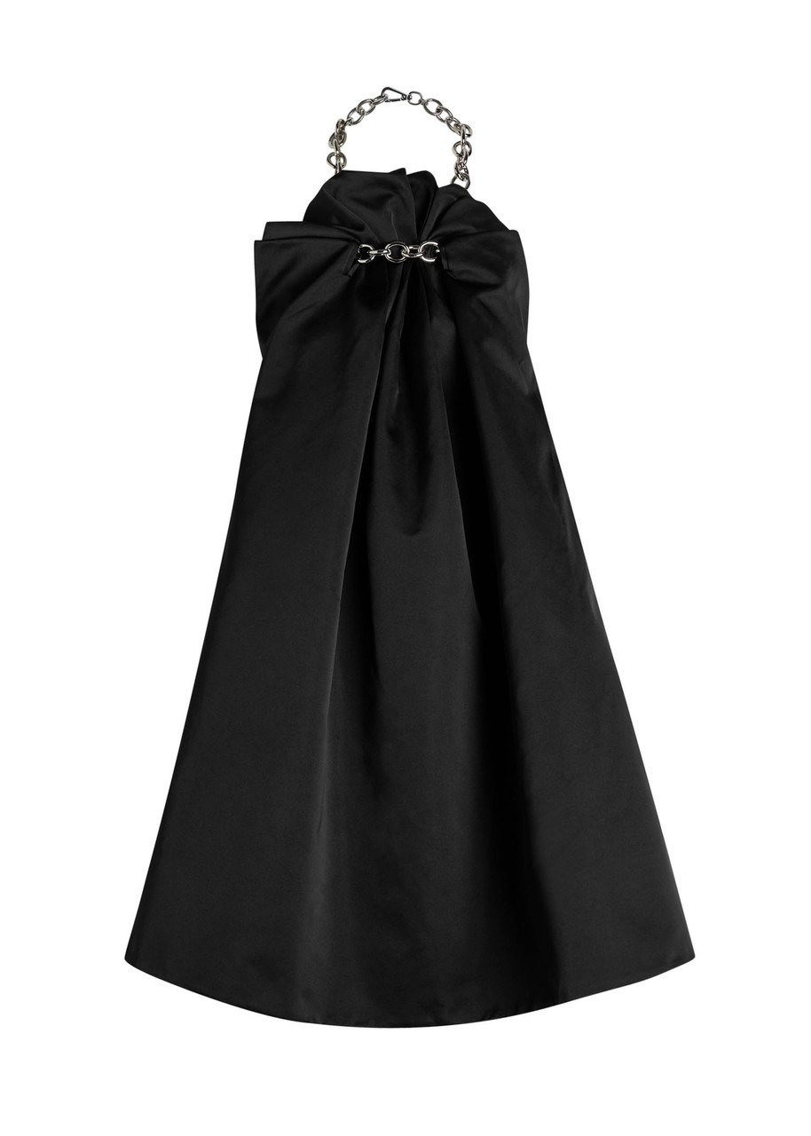 Info & Care Simone Rocha satin dress Lobster-clasp fastening chain halterneck, pleated ruched detail at front with chain embellishment, curved hem, fully lined; Concealed zip fastening at back 100% polyester; lining: 60% acetate, 40% cupro Dry clean Size & Fit Length shoulder to hem:;31 inches/ 79cm Midweight Flared fit Model is 5'10"/ 178cm and wears a size UK8
