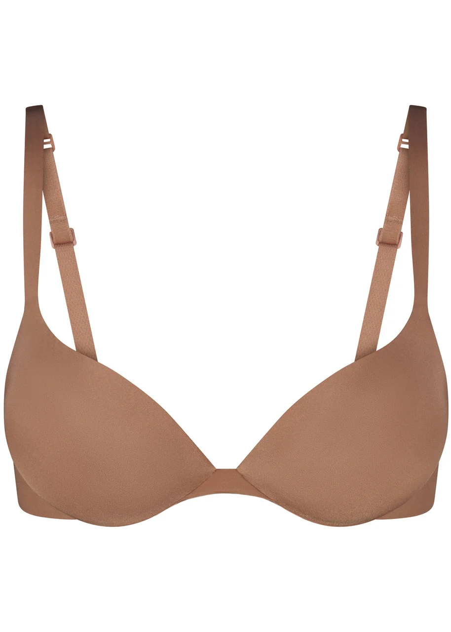 Style Notes The Ultimate Bra redefines traditional push-up bras by enhancing your natural bust shape and completely transforming the look, shape, and fullness of your bust. This bra is made of a super soft sheen microfibre fabric with extra compressive side wings for smoothing. With a comfortable, concealed underwire and premium teardrop shaped foam pads, this bra sits seamlessly under clothing. Info & Care Skims push-up bra Part of the Ultimate collection Soft foam push-up pads for seamless look, lightweight, plunge neckline, concealed underwire with a soft brushed casing, elasticated adjustable straps Hook and eye closure at back 84% nylon, 16% elastane Hand wash cold Size & Fit Designed for a snug fit