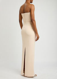 Info & Care Solace London stretch-crepe gown Strapless, pleated faille bodice, boned bodice, back vent Concealed hook and zip fastenings at back 100% polyester; fabric 2: 95% polyester, 5% elastane Dry clean Size & Fit Length shoulder to hem: 54.5 inches/ 138.5cm Midweight Slim fit Model is 5'9"/ 175cm and wears a size;US4