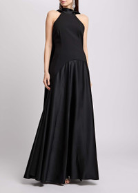 Info & Care Solace London;crepe;dress Draped panels at high neck, adjustable shoulder straps, darted bodice, satin skirt with drape detail at back, back vent, curved hem, partially lined Concealed zip fastening at back 100% polyester; lining: 95% polyester, 5% elastane Dry clean Size & Fit Length shoulder to hem: 60 inches/ 152cm Midweight; Slim fit, loose flared skirt Model is 5'9"/ 175cm and wears a size;US4