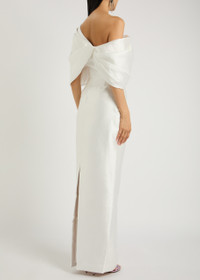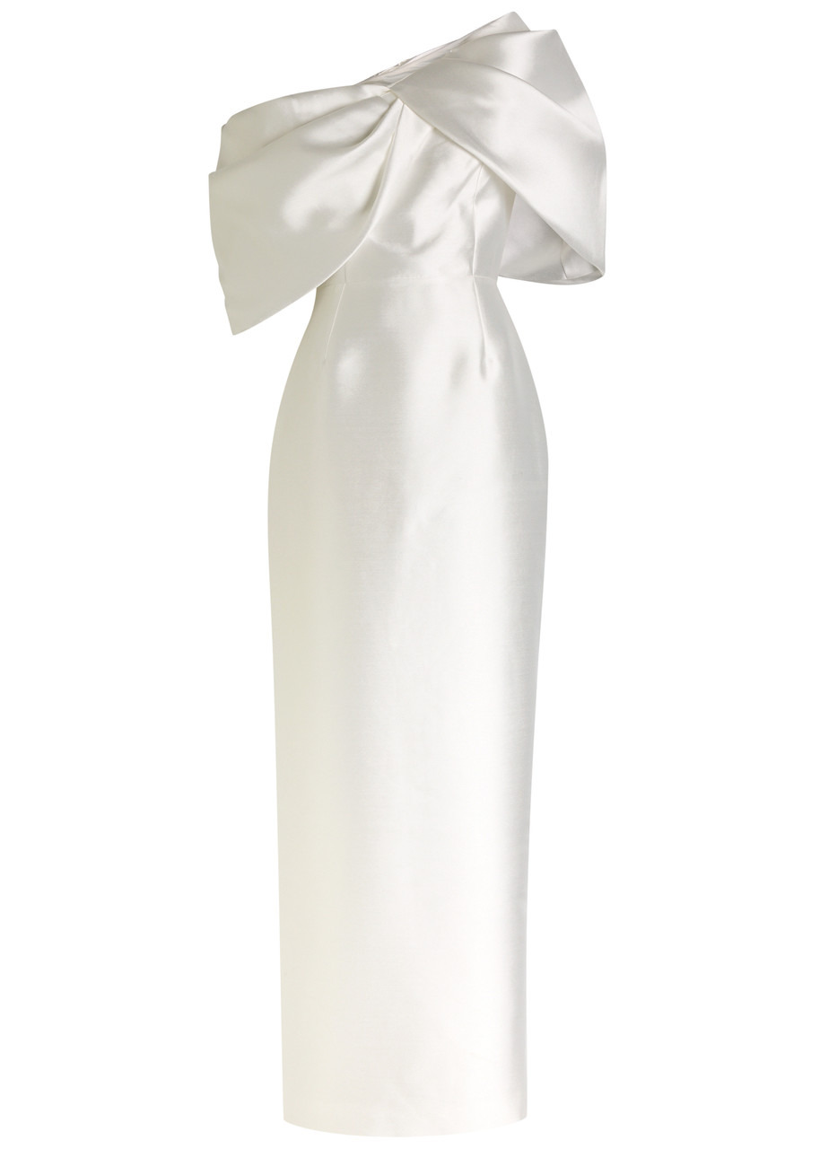 Info & Care Solace London;faille gown One-shoulder,;oversized draped;sleeves with pleated details, boned bodice, back vent, fully lined Concealed zip fastening at side 100% polyester; lining: 95% polyester, 5% elastane Dry clean Size & Fit Length shoulder to hem: 60 inches/ 152.5cm Midweight Slim fit Model is 5'9"/ 175cm and wears a size UK8