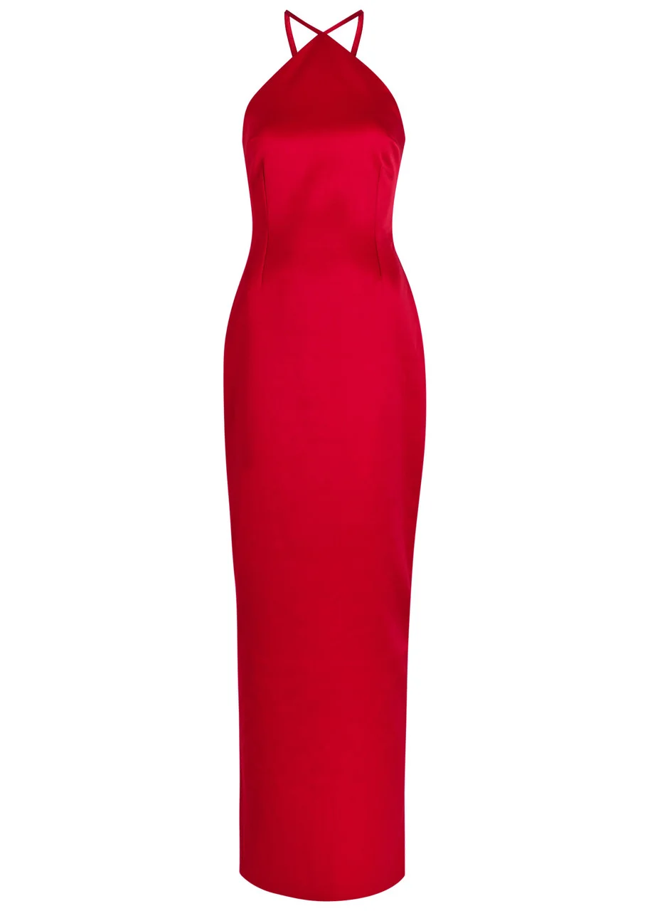Info & Care Solace London satin dress Halterneck, adjustable cross-over shoulder straps, boning through bodice, back vent, fully lined Concealed zip fastening at back 100% polyester; lining: 95% polyester, 5% elastane Dry clean Size & Fit Length shoulder to hem: 63 inches/ 160cm Midweight Slim fit, straight cut Model is 5'10"/ 178cm and wears a size;UK8
