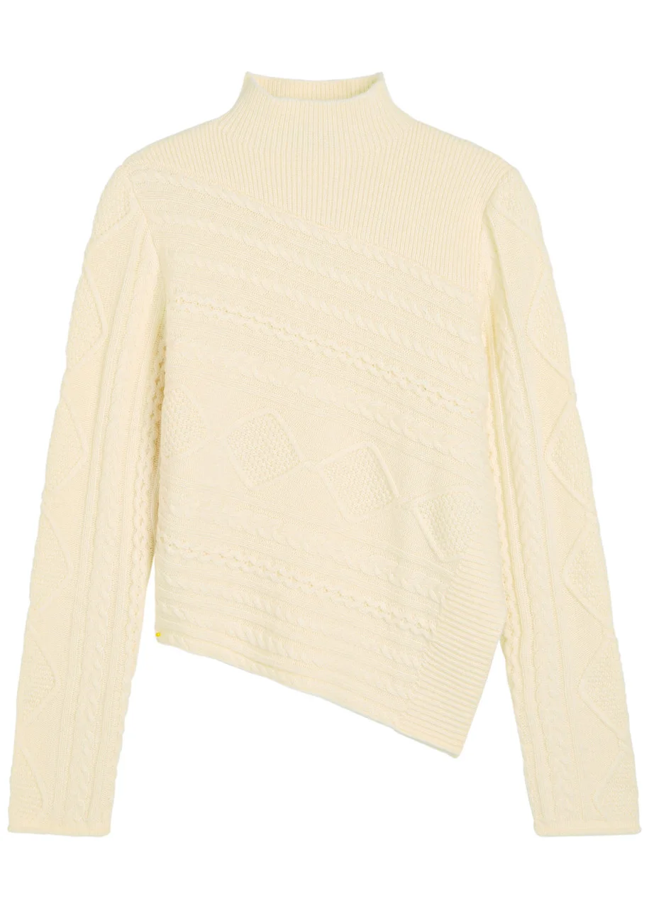 Info & Care Staud wool-blend jumper Cable-knit, high-neck, ribbed trims, asymmetrical hem, side split Slips on; 50% wool, 50% nylon; Dry clean; Size & Fit Length shoulder to hem: 19 inches/ 48.5cm; 2: 24.5 inches/ 62.5cm; Midweight Regular fit Model is 5'10"/ 178cm and wears a size small