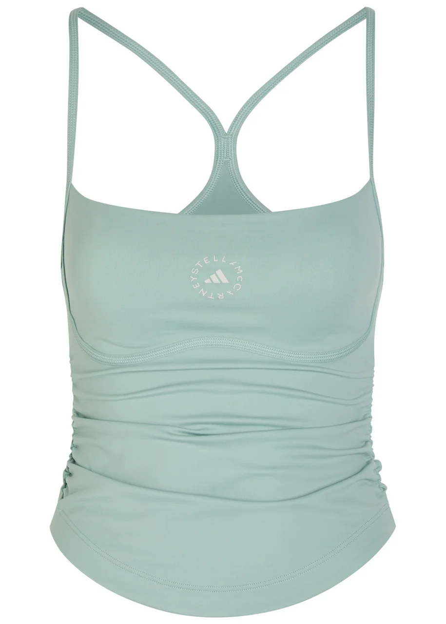 Info & Care adidas X Stella McCartney stretch-jersey;top Square-neck, printed logo at front, removable padded cups, ruching at sides Slips on 73% polyamide, 27% elastane Machine wash Coordinating items available Size & Fit Length shoulder to hem: 19 inches/ 48cm Midweight Slim fit, slightly cropped Model is 5'9"/ 175cm and wears a size small