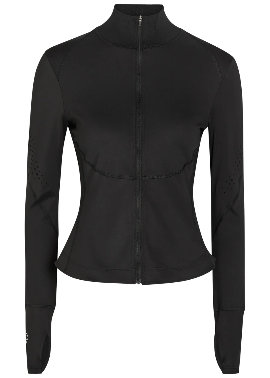 Info & Care adidas X Stella McCartney stretch-jersey jacket Ribbed high-neck, perforated details, printed logo at right cuff, thumb holes, zip-fastening back pocket Zip fastening through front 73% polyamide, 27% elastane Machine wash Coordinating items available Size & Fit Length shoulder to hem: 20 inches/ 50.5cm Midweight Slim;fit Model is 5'9"/ 175cm and wears a size small