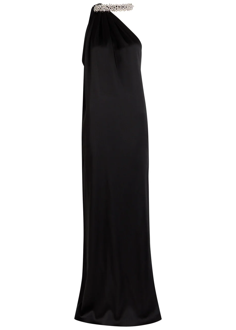 Info & Care Stella McCartney satin;gown Draped, asymmetric halterneck with faux pearl embellishments, wrap-over bust, side slip pockets, side split Concealed magnetic push-stud fastening at back neck 73% acetate, 27% viscose Dry clean Size & Fit Length shoulder to hem: 67 inches/ 170.5cm Midweight Loose fit, draped style Model is 5'9"/ 175cm and wears a size;IT40