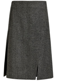 Info & Care Stella McCartney wool skirt Herringbone, side split, asymmetric front split at hem Concealed zip fastening at back 100% wool Dry clean Size & Fit Length waist to hem: 25 inches/ 63.5cm Midweight Designed to sit at the waist, A-line cut Tailored style Model is 5'9"/ 175cm and wears a size;IT40