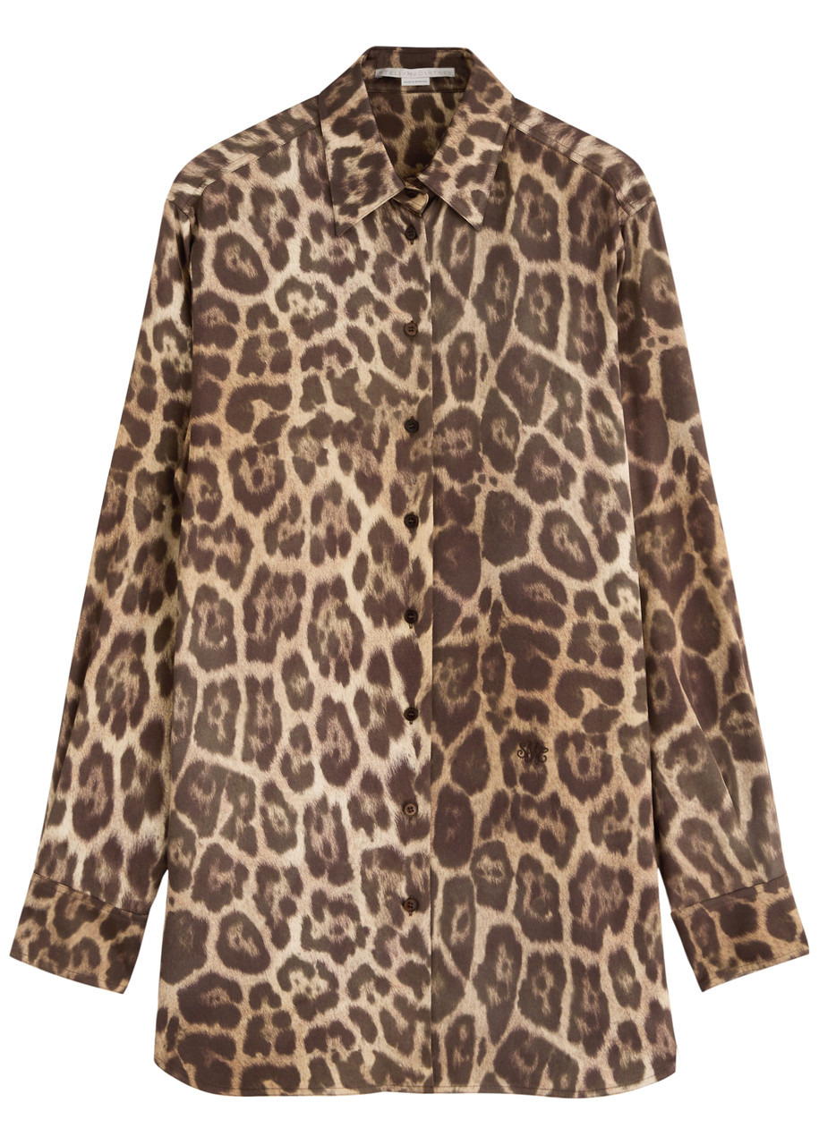 Info & Care Stella McCartney satin shirt Leopard print, dropped shoulders, button-fastening cuffs,;logo embroidery, side split, curved hem Button-fastenings through front 100% viscose Dry clean Size & Fit Length shoulder to hem: 32 inches/ 81cm Midweight Relaxed;fit Model is 5'9"/ 175cm and wears a size IT40