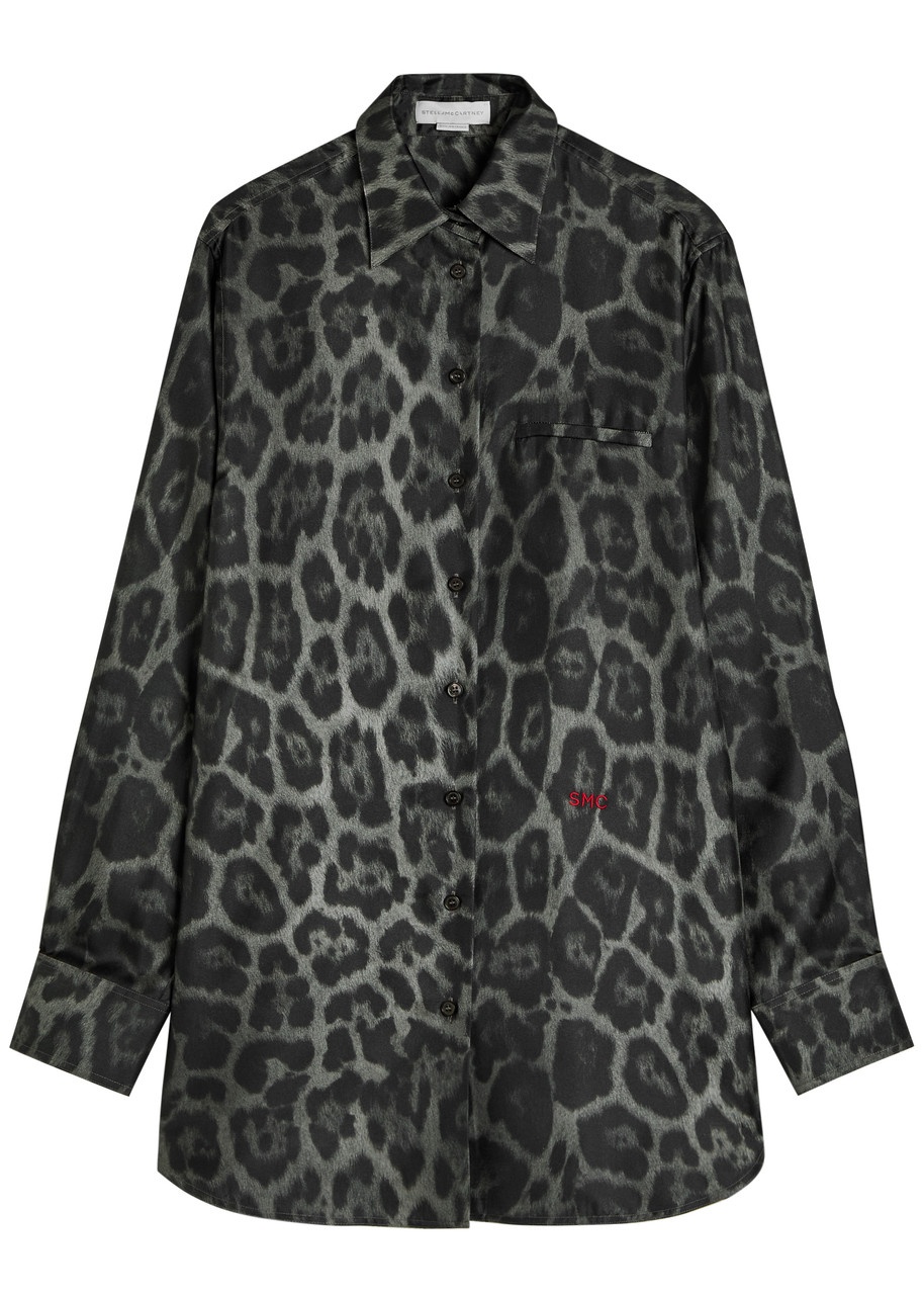 Info & Care Stella McCartney silk shirt Leopard Print, button-fastening cuffs, chest slit pocket, logo embroidery at front, side splits, curved hem Button-fastenings through front 100% silk Dry clean Size & Fit Length shoulder to hem:;31 inches/ 79cm Midweight Relaxed fit Model is 5'9"/ 175cm and wears a size IT40