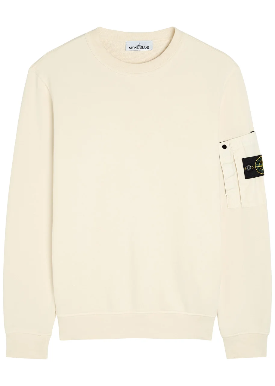 Info & Care Stone Island cotton sweatshirt Crew-neck, detachable designer plaque at sleeve, velcro and press-stud fastening pocket at sleeve, ribbed trims Slips on;; 100% cotton Machine wash; Size & Fit Length shoulder to hem: 26.5 inches/ 67.5cm Midweight Regular fit Model is 6'2"/ 188cm, chest size 38 inches and wears a size medium