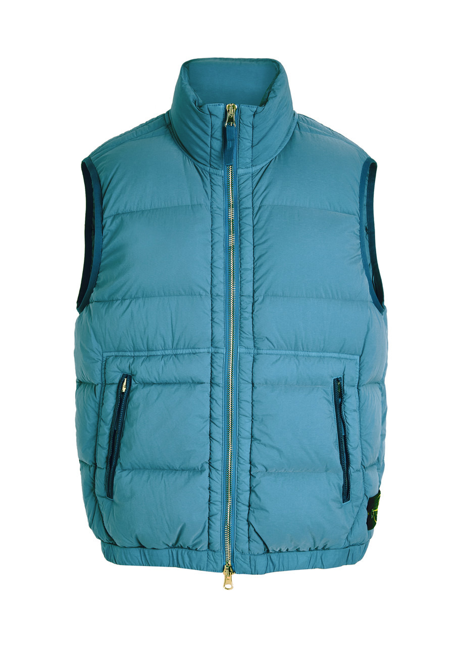Info & Care Stone Island;nylon gilet Quilted, high neck, zip-fastening side pockets, button-fastening designer patch at hem, garment dyed Two-way zip fastening through front 84% polyamide, 16% elastane; padding: 90% duck down, 10% duck feather Machine wash Size & Fit Length shoulder to hem: 25.5 inches/ 65cm Midweight Regular fit Model is 6'1"/ 185cm, chest size 38.5 inches and wears a size medium