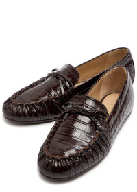 Info & Care Stuart Weitzman patent leather loafers Debossed crocodile-effect, bow embellishment, whip stitching gathered front, round toe Slip-on Size & Fit Only available in full sizes, go up to the nearest whole size if you take a half size