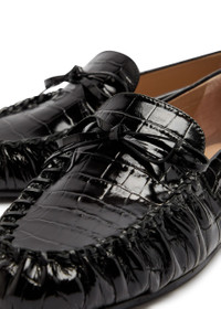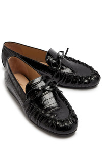 Info & Care Stuart Weitzman patent leather loafers Debossed crocodile-effect, bow embellishment, whip stitching gathered front, round toe Slip-on Size & Fit Only available in full sizes, go up to the nearest whole size if you take a half size