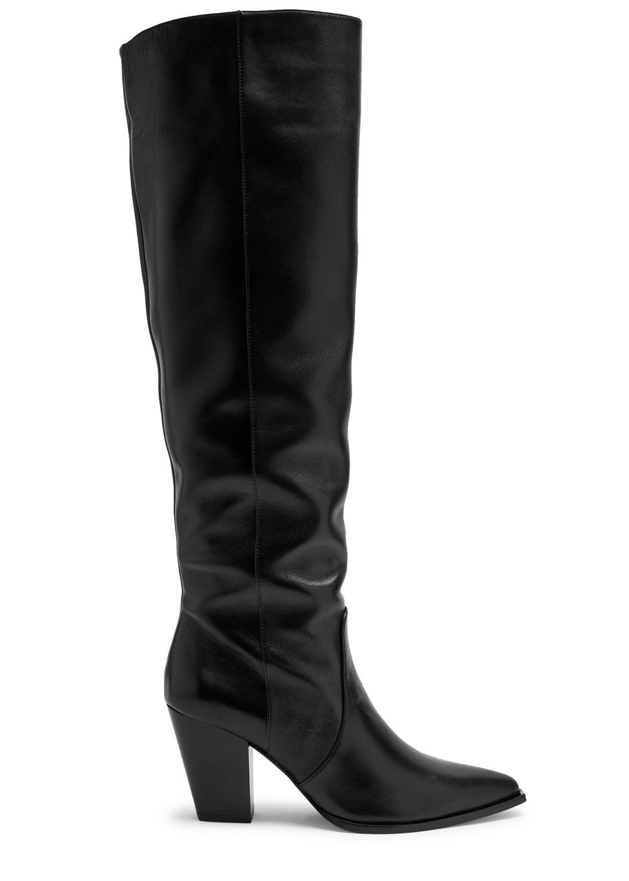 Info & Care Stuart Weitzman leather knee-high boots Heel measures approximately 3 inches/ 75mm Western-style panels, pointed;toe Zip fastening at side Size & Fit Narrow across the toe Only available in full sizes, go up to the nearest whole size if you take a half size;