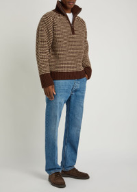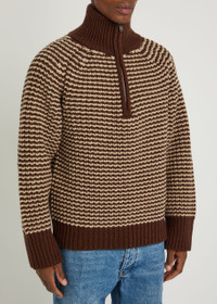 Info & Care Studio Nicholson wool jumper Striped intarsia, zip-fastening high-neck, raglan sleeves, ribbed trims Slips on 100% virgin wool Hand wash Size & Fit Length shoulder to hem: 27 inches/ 68.5cm Midweight Relaxed fit Model is 6'1"/ 185cm, chest size 38.5 inches and wears a size medium