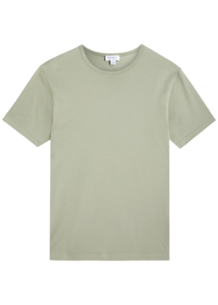 Info & Care Sunspel cotton T-shirt Ribbed crew-neck Slips on 100% cotton Machine wash Size & Fit Length shoulder to hem: 28 inches/ 71cm Midweight Regular fit Model is 6'1"/ 185cm, chest size 38 inches and wears a size medium
