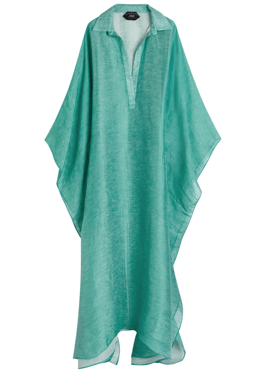 Info & Care Taller Marmo semi-sheer linen-blend kaftan Slubbed, open camp collar, low V-neck, cascading dolman sleeves, asymmetric hem Slips on 57% linen, 30% linen, 13% nylon Dry clean Size & Fit Length shoulder to hem: 1: 57 inches/ 145cm; 2: 65 inches/ 170cm Midweight Loose fit One size; will comfortably wear a size UK6-UK16