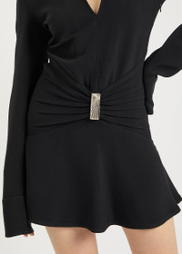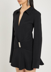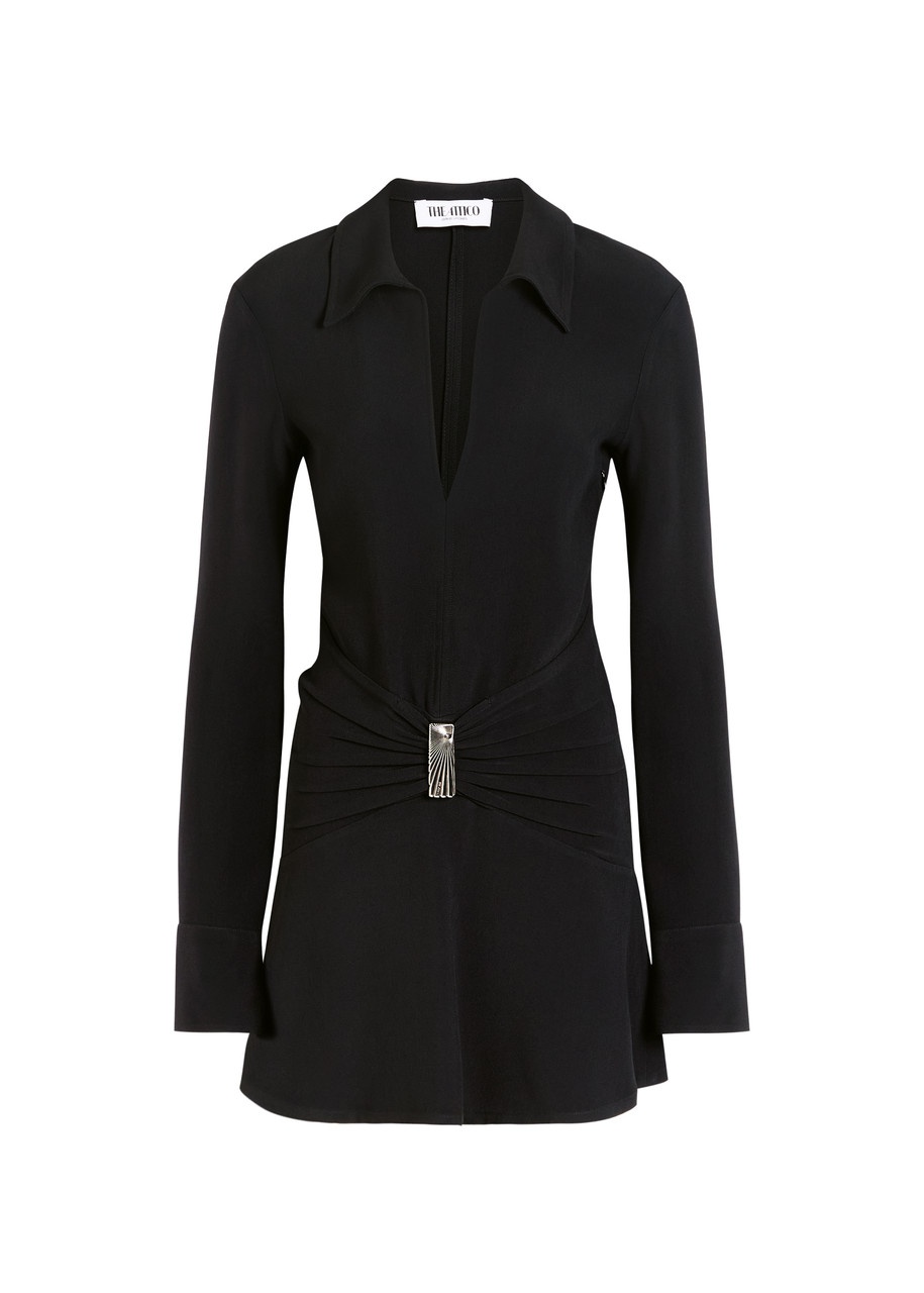 Info & Care The Attico crepe dress V-neck, button-fastening cuffs, designer-engraved embellishment at gathered waist Concealed zip fastening at side 50% attico, 50% viscose Dry clean Size & Fit Length shoulder to hem: 33 inches/ 83.5cm Midweight Slim across the waist, flared skirt Model is 5'10"/ 178cm and wears a size;IT40