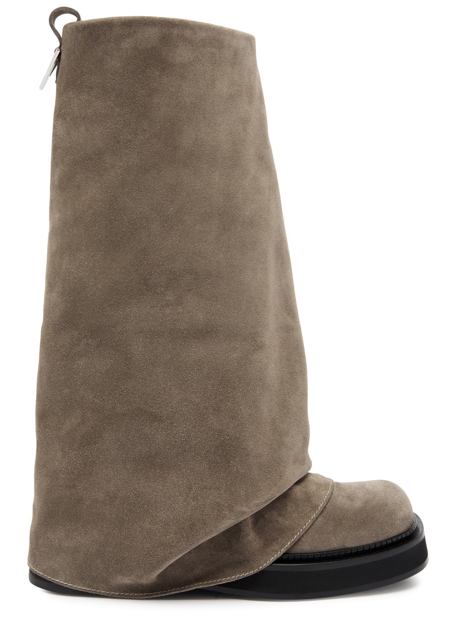 Info & Care The Attico;suede combat boots; Flatform sole measures approximately 1 inch/ 25mm with a 1.5 inch/ 40mm stacked heel Ruched fold-over design, metal designer plaque and tab at cuff, square toe; Pull-on Size & Fit Only available in full sizes, go up to the nearest whole size if you take a half size;