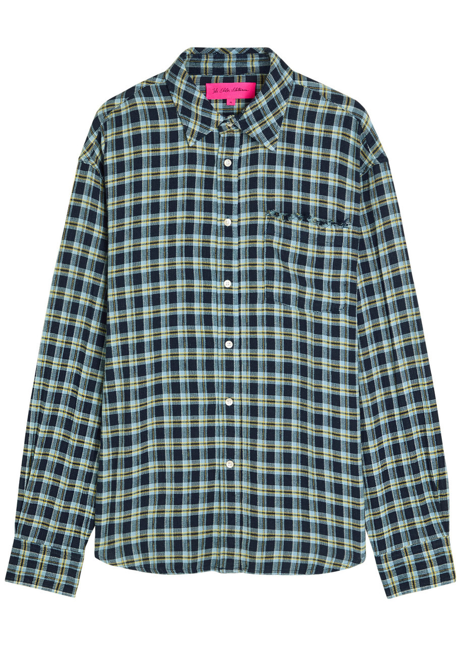Info & Care The Elder Statesman cotton shirt Plaid, button-fastening cuffs, distressing at chest patch pocket, box pleat at back, curved hem Button fastenings through front 100% cotton Machine wash Co-ordinating item available Size & Fit Length shoulder to hem: 30 inches/ 76cm Midweight Relaxed fit Model is 6'2"/ 188cm, chest size 38 inches and wears a size medium