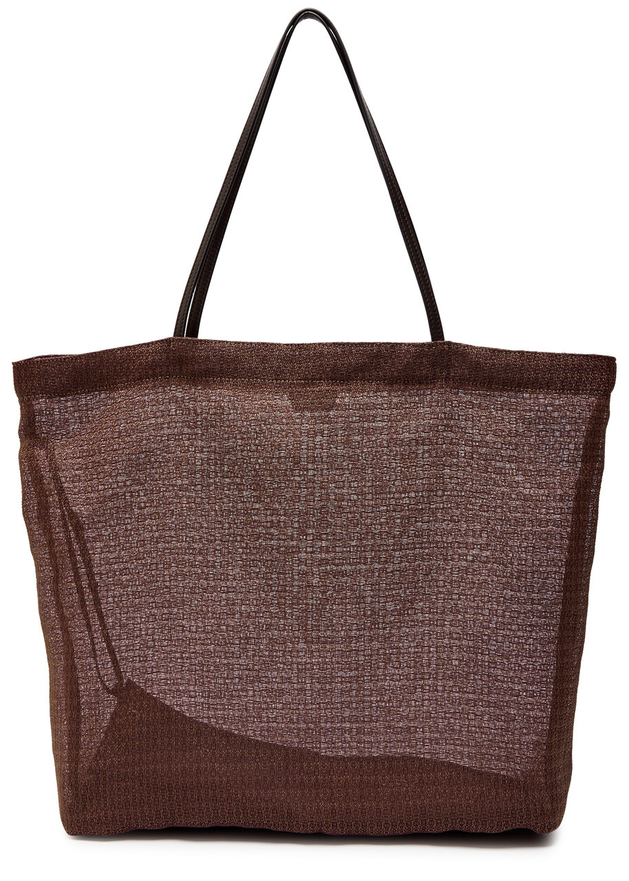 Info & Care The Row semi-sheer woven tote Two leather shoulder straps, internal detachable leather pouch Open top Size & Fit Width: 14 inches/ 35.5cm Height: 14 inches/ 35.5cm Depth: 5.5 inches/ 14cm Shoulder strap drop: 10; inches/ 25.5cm Pouch dimensions: 18cm x 13cm x 1cm