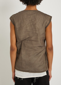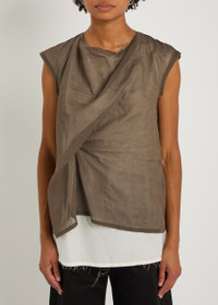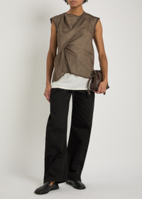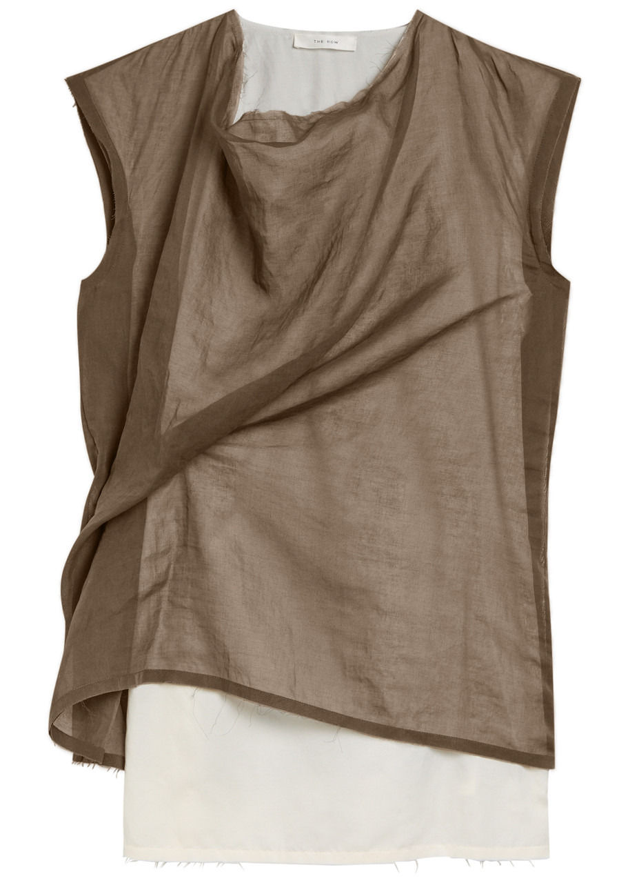 Info & Care The Row;cotton-organza;top Gathered design, crew-neck, draped details, underlay visible at asymmetric hem, frayed trims Slips on 100% cotton; lining: 100% silk Machine wash Size & Fit Length shoulder to hem: 1: 20 inches/ 51cm; 2: 27 inches/ 68.5cm Midweight Loose fit Cinched style at waist Model is 5'9"/ 175cm and wears a size;US4