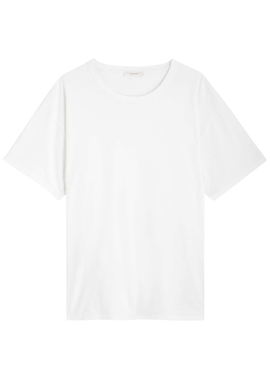 Info & Care The Row cotton T-shirt Ribbed crew-neck, dropped shoulders Slips on 100% cotton Hand wash Size & Fit Length shoulder to hem: 27 inches/ 68.5cm Midweight Oversized fit Model is 5'10"/ 178cm and wears a size small;