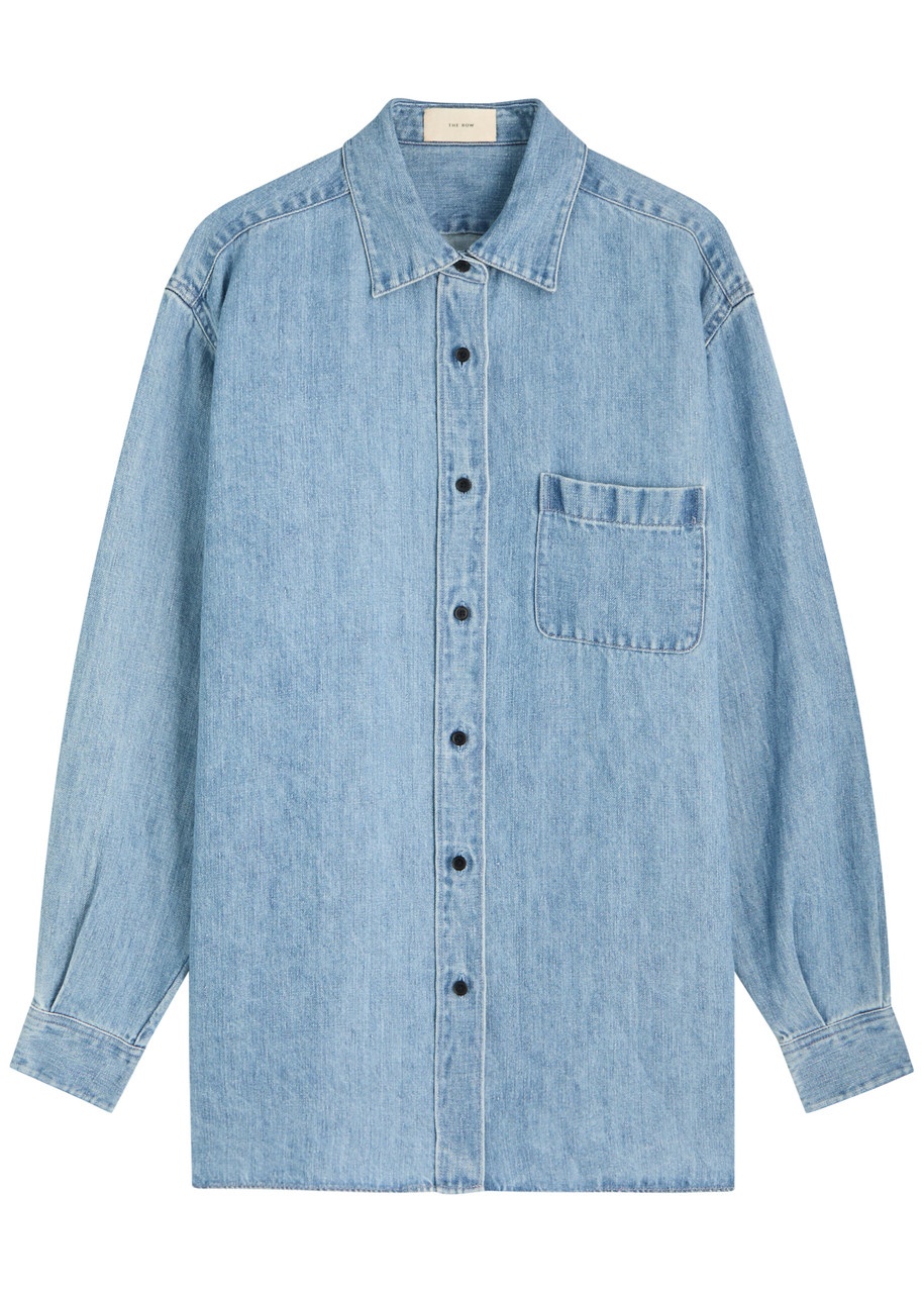 Info & Care The Row;denim shirt Dropped shoulders, pleats at button-fastening cuffs, chest pocket, side splits, curved hem, longer back hem, washed and faded finish Button fastenings through front 100% linen Dry clean Size & Fit Length shoulder to hem: 30.5 inches/ 77.5cm; back: 32.5 inches/ 83cm Midweight Loose fit Model is 5'10"/ 178cm and wears a size US4
