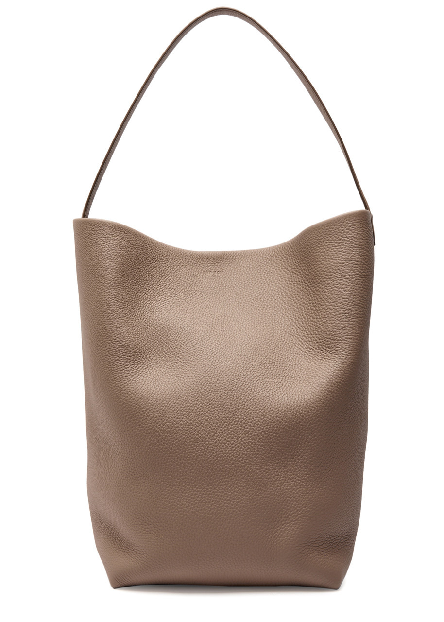 Info & Care The Row grained leather tote Shoulder strap, designer stamp, fully lined Tie fastening at open top; Size & Fit Width: 15.5 inches/ 39.5cm; Height: 14 inches/ 35.5cm; Depth: 8 inches/ 20.5cm; Shoulder strap drop: 12 inches/ 30.5cm
