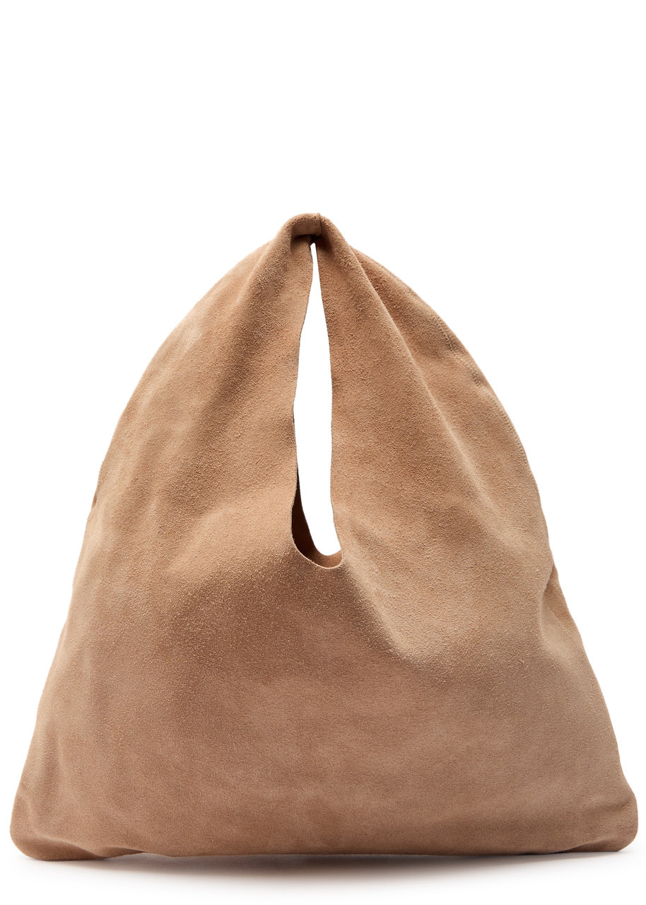 Info & Care The Row suede top handle bag Top handle, draped design, debossed logo Open top Size & Fit Width: 12.5 inches/ 32cm Height: 7 inches/ 18cm Depth: 0.5 inches/ 1.5cm Top handle drop: 6 inches/ 15cm