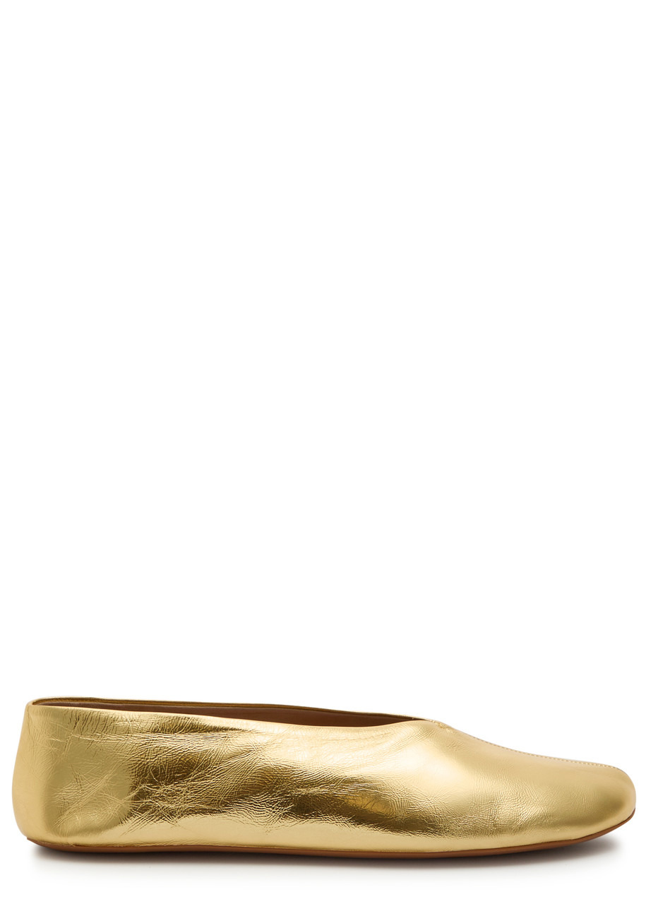 Info & Care The Row metallic leather ballet flats; Low-cut vamp, rubber sole, textured finish, round toe; Slip-on; Size & Fit Only available in full sizes, go up to the nearest whole size if you take a half size;