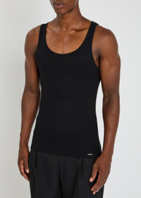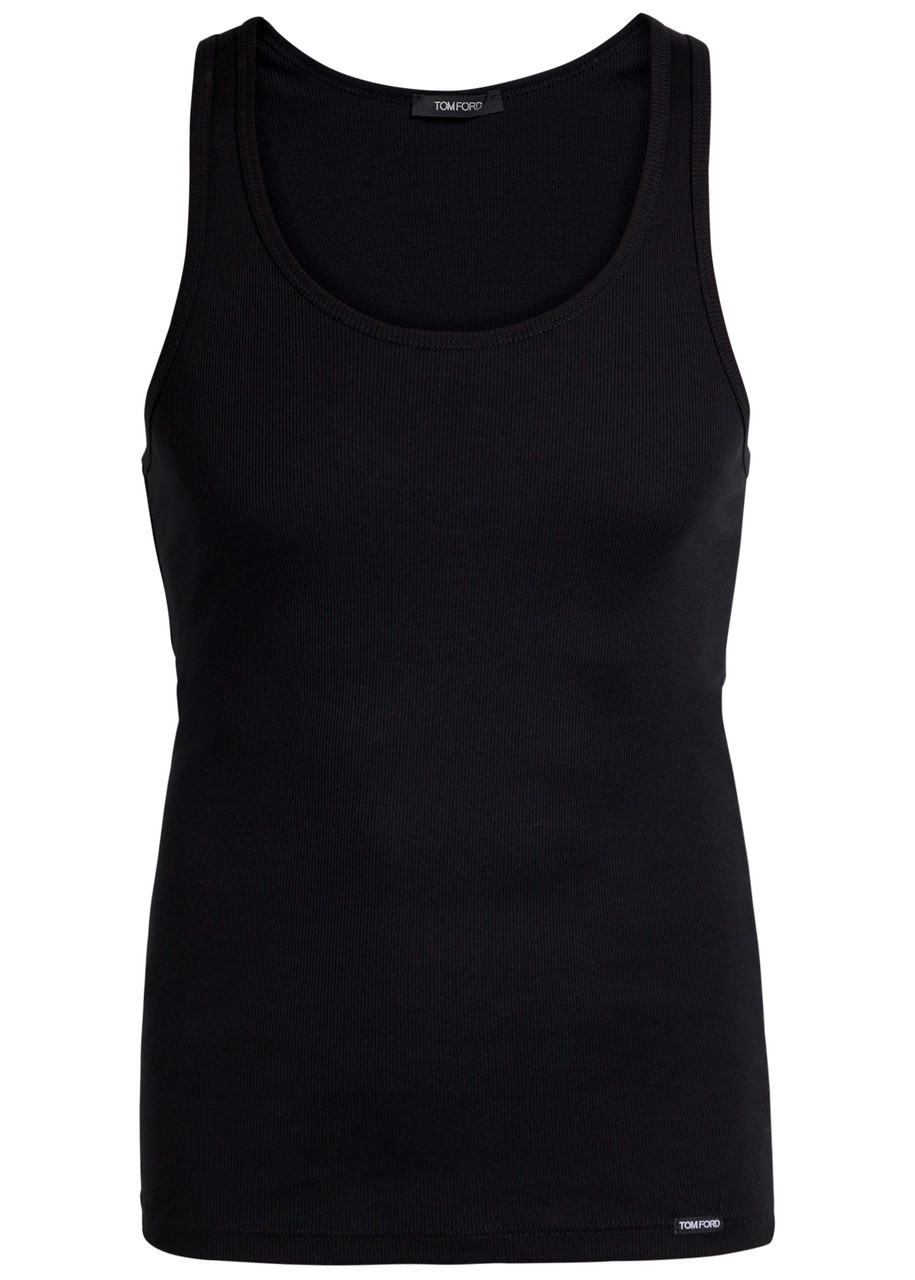 Info & Care Tom Ford jersey tank Ribbed, scoop-neck, designer plaque at hem, racer back; Slips on 50% cotton, 50% modal Machine wash Size & Fit Length shoulder to hem: 27.5 inches/ 70cm Midweight Slim fit Model is 6'1"/ 185cm, chest size 38.5 inches and wears a size medium