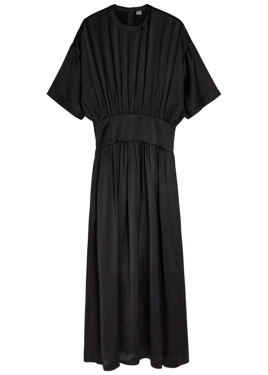 Info & Care Toteme satin dress Crew-neck, dropped shoulders, waistband panel,;pleated and draped details Concealed zip fastening at back 100% viscose Dry clean Size & Fit Length shoulder to hem: 56.5 inches/ 143.5cm Midweight Relaxed fit, cinched at the waist A-line cut Model is 5'9"/ 175cm and wears a size;FR36;