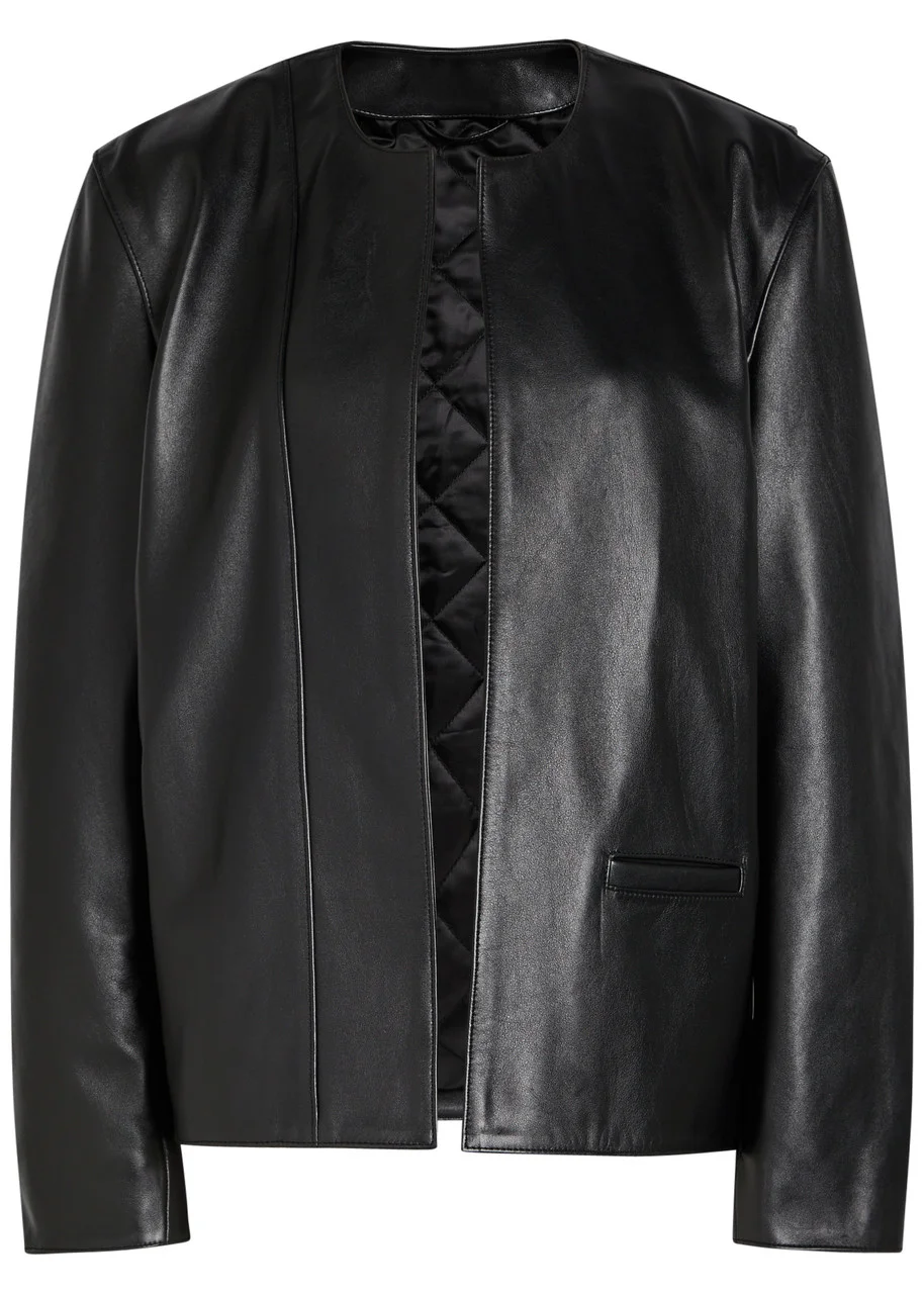 Info & Care Toteme leather jacket; Quilted, round-neck, side slip pockets, welt pocket at front, wide box pleat at back, internal slip pocket, fully lined, open front Slips on 100% calf leather; lining: 100% viscose; fill: 100% polyester Specialist clean; Size & Fit Length shoulder to hem: 25 inches/ 63.5cm Heavyweight Boxy fit, oversized style Model is 5'9"/ 175cm and wears a size;FR36
