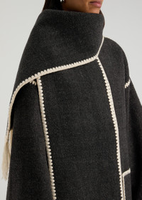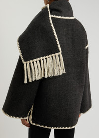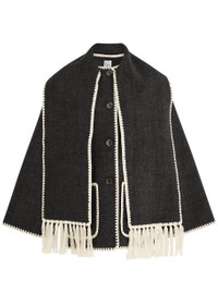 Style Notes Toteme's jacket is a sell-out style that's loved for its cool hybrid design. Decorated with contrasting whipstitch trims, this wool-blend layer is tailored to a loose, boxy silhouette with a built-in scarf that wraps around the shoulders to keep you warm and cosy.; Info & Care Toteme wool-blend jacket Scarf-effect panel with fringed ends, round-neck, dropped shoulders, two patch pockets, side splits, contrasting whipstitch trims Button fastenings through front 68% wool, 20% recycled wool, 12%;recycled polyamide; Dry clean; Size & Fit Length shoulder to hem: 29.5 inches/ 75cm Midweight Loose, boxy fit Model is 5'8"/ 172cm and wears a size;FR36