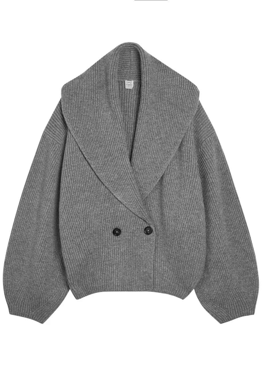 Info & Care Toteme wool-blend cardigan Ribbed-knit, shawl lapels, dropped shoulders Double-breasted button fastenings at front;; 94% wool, 6% polyamide Hand wash Size & Fit Length shoulder to hem: 25 inches/ 63.5cm Midweight Relaxed fit Model is 5'10"/ 178cm and wears a size small