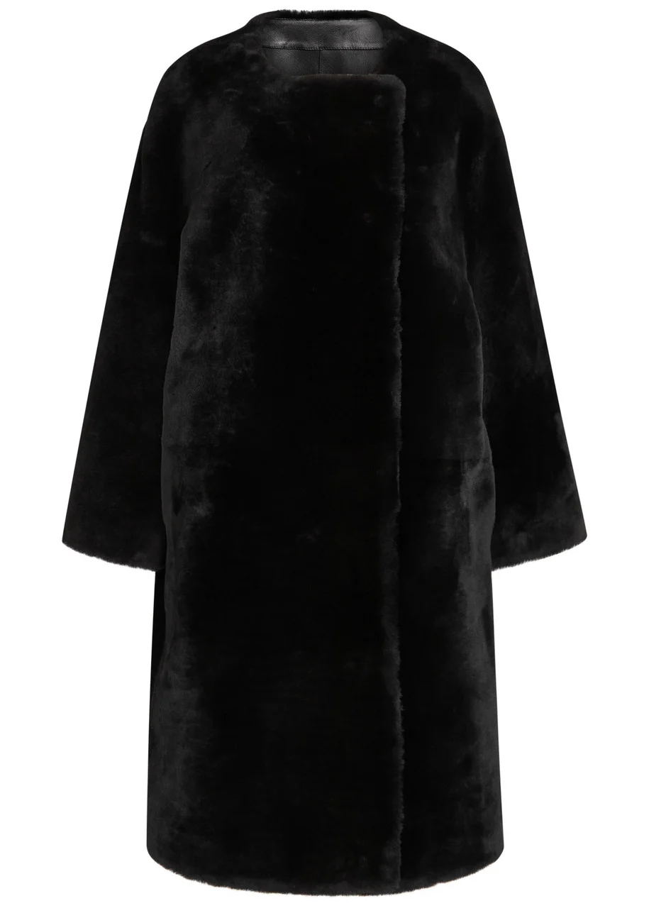 Collarless shearling coat black