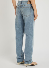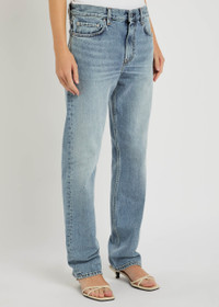 Info & Care Toteme denim jeans Low-rise fit, straight-leg cut, belt loops, five pockets, designer plaque, slightly distressed trims, whiskered and faded finish Concealed zip and button fastening at front 100% organic cotton Machine wash cold inside to avoid colour transfer Size & Fit Front rise: 11 inches/ 28cm Inside leg length:;31 inches/ 79cm Midweight Model is 5'9"/ 175cm and wears a size W27