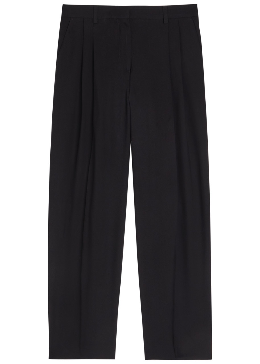 Info & Care Toteme twill trousers Belt loops, pleat at waist, side slip pockets, pressed crease through legs, two back slit pockets Concealed zip, hook and button fastenings at front 100% viscose Dry clean Size & Fit Inside leg length: 31 inches/ 79cm Midweight Relaxed fit, slim across the waist Model is 5'10"/ 178cm and wears a size FR36