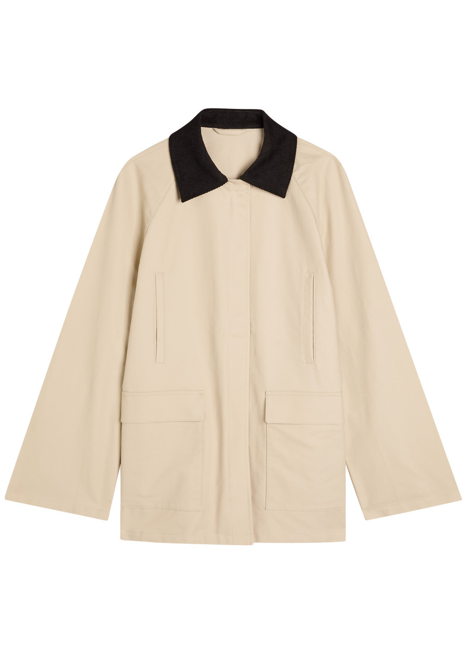 Info & Care Toteme cotton jacket Corduroy collar, raglan sleeves, two chest slit pockets, two press-stud fastening front flap pockets, side slip pockets, back vents Concealed zip and press-stud fastenings through front; 100% organic cotton Dry clean; Size & Fit Length shoulder to hem: 29 inches/ 73.5cm Midweight Loose fit Model is 5'9"/ 175cm and wears a size;FR36