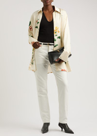 Info & Care Toteme denim jeans Mid-rise fit, tapered-leg cut, belt loops, five pockets, debossed logo designer plaque Partially concealed zip and button fastenings at front 100% cotton Machine wash cold inside out to avoid colour transfer Size & Fit Front rise: 10 inches/ 25.5cm Inside leg length: 29 inches/ 73.5cm Midweight Model is 5'10"/ 178cm and wears a size W27