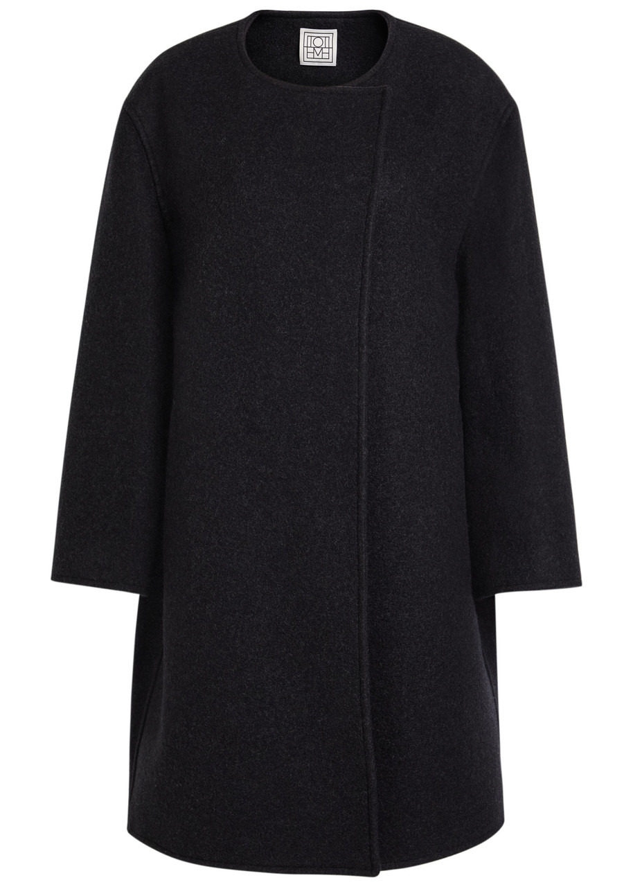 Info & Care Toteme wool-blend coat Round-neck, internal button-fastening pocket, fully lined Slips on 85% wool, 15% polyamide Dry clean Size & Fit Length shoulder to hem:;39 inches/ 99cm Midweight Loose fit Model is 5'9"/ 175cm and wears a size FR36