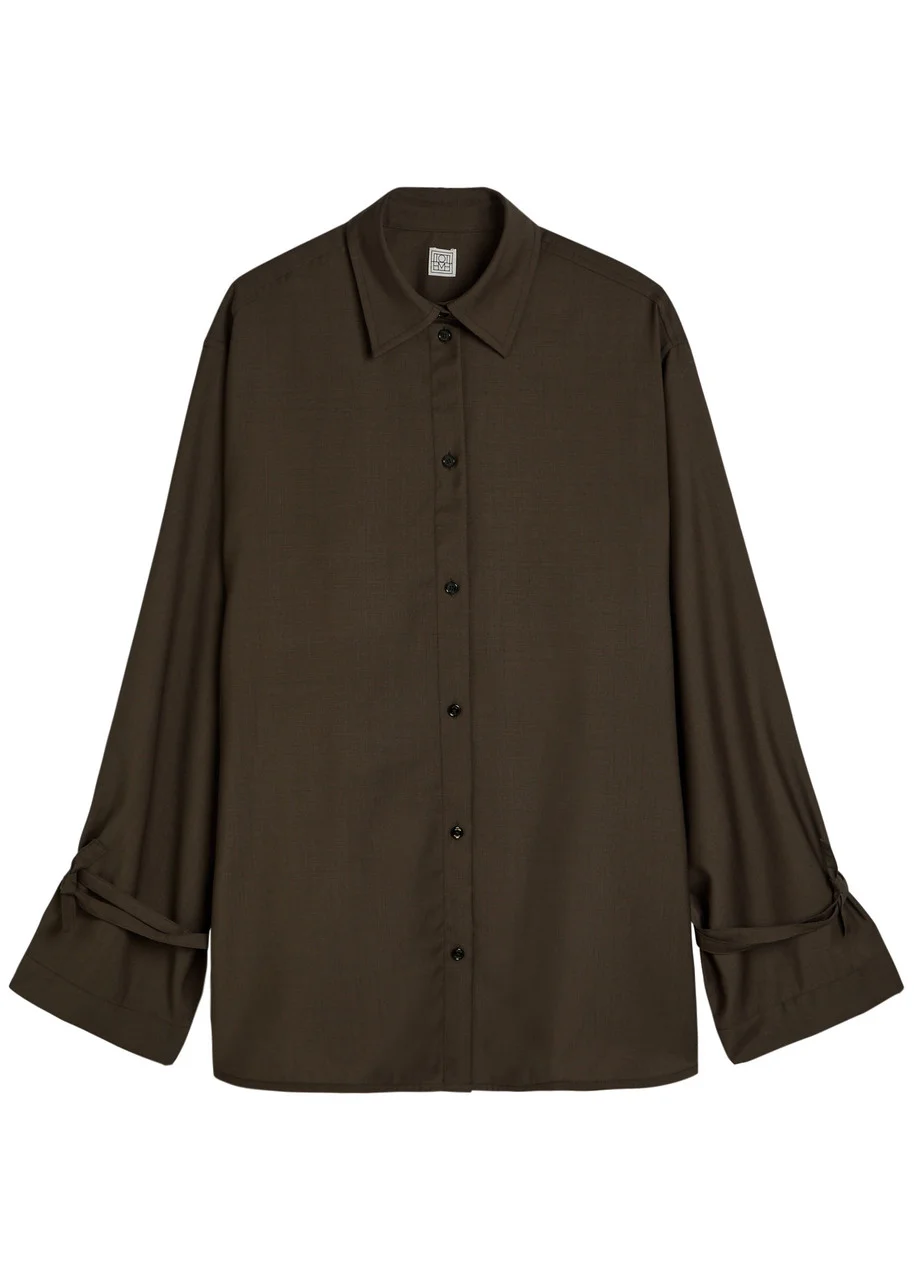 Info & Care Toteme wool shirt Dropped shoulders, belt loops and detachable tie at adjustable cuffs, inverted pleat through back, curved longer back hem Button fastenings through front 100% wool Dry clean Size & Fit Length shoulder to hem: 28 inches/ 71cm; back: 31 inches/ 79cm Midweight Relaxed fit, oversized style Model is 5'9"/ 175cm and wears a size;FR36