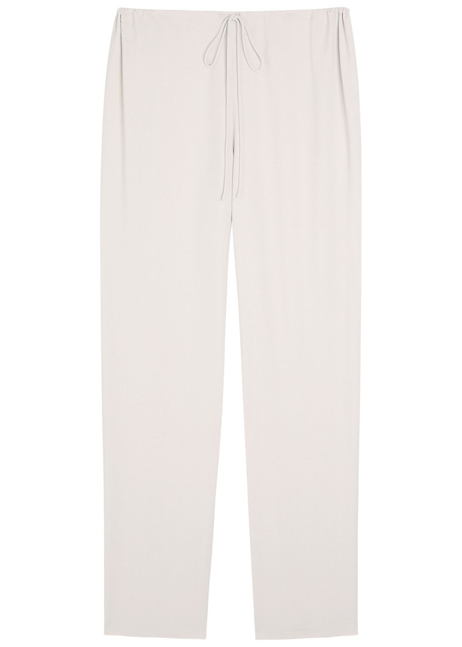 Info & Care TOVE crepe trousers Drawstring at partially elasticated waistband; Concealed zip, hook and button fastening at front 70% viscose, 28% wool, 2%;elastane Dry clean Size & Fit Inside leg length: 31 inches/ 79cm Midweight Loose, straight-leg cut Model is 5'8"/ 173cm and wears a size small