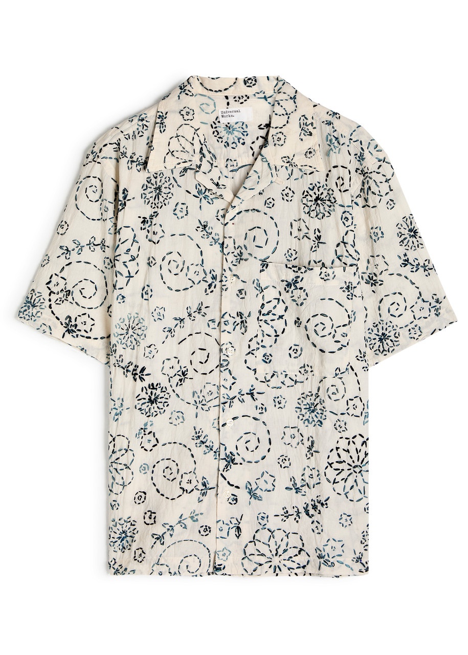 Info & Care Universal Works cotton shirt Embroidered design, button-fastening camp collar,;chest patch pocket, side splits, longer back hem Button fastening through front 100% cotton; Machine wash; Size & Fit Length shoulder to hem: 26.5 inches/ 66cm; back 28 inches/ 71cm Midweight Relaxed fit Model is 6'1"/ 185cm, chest size 38 inches and wears a size medium;