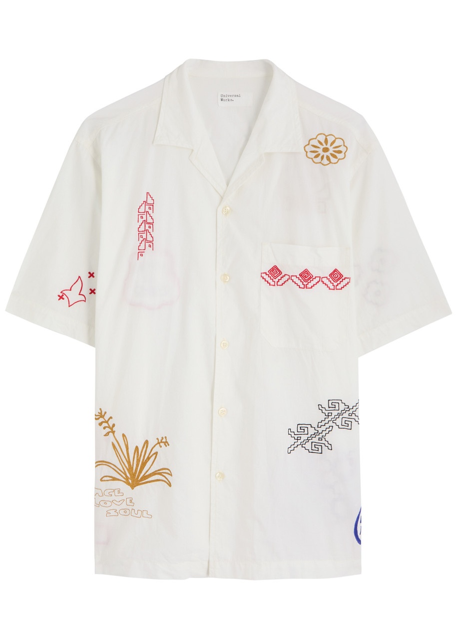 Info & Care Universal Works cotton-poplin shirt Embroidered, camp collar, chest patch pocket, side splits at hem Button fastenings through front 100% cotton Machine wash Size & Fit Length shoulder to hem: 26 inches/ 66cm Midweight Regular fit Model is 6'1"/ 185cm, chest size 38.5 inches and wears a size medium
