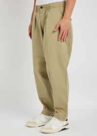 Info & Care Universal Works cotton-twill trousers Concealed elasticated drawstring waistband, belt loops, pleats at waist, two side slant pockets, button-fastening flap pocket at back, button-fastening back slit pocket Partially concealed button fastenings at front 100% cotton Machine wash Size & Fit Inside leg length: 29 inches/ 74cm Midweight Relaxed fit, tapered cut Model is 6'0"/ 183cm and wears a size UK W32