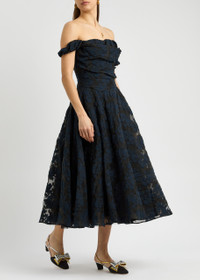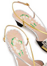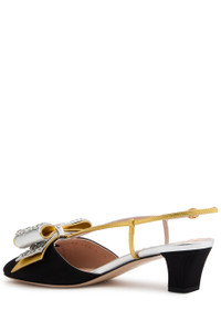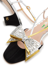 Info & Care Valentino Garavani moire pumps Heel measures approximately 2 inches/ 45mm Two-tone crossover metallic leather straps, tow-tone layered bow embellishment, crystal and mirrored embellishments, VLogo plaque at heel, cut-out detail at almond toe Adjustable buckle-fastening ankle;strap Size & Fit Only available in full sizes, go up to the nearest whole size if you take a half size
