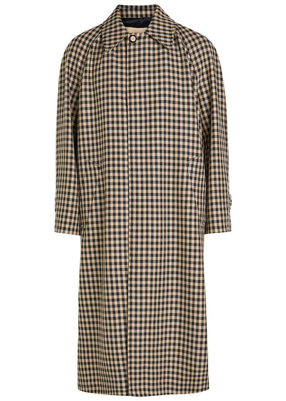 Info & Care Valentino Garavani woven coat Checked, raglan sleeves, tab at adjustable button-fastening cuffs, embellished button, side slip pockets, internal slip pocket, internal button-fastening slip pocket, partially lined Partially concealed button fastenings at front 55% cotton, 45% virgin wool; lining: 100% cupro Dry clean; Size & Fit Length shoulder to hem: 47 inches/ 119.5cm Midweight Loose fit Model is 6'2"/ 188cm, chest size 38 inches and wears a size;IT50