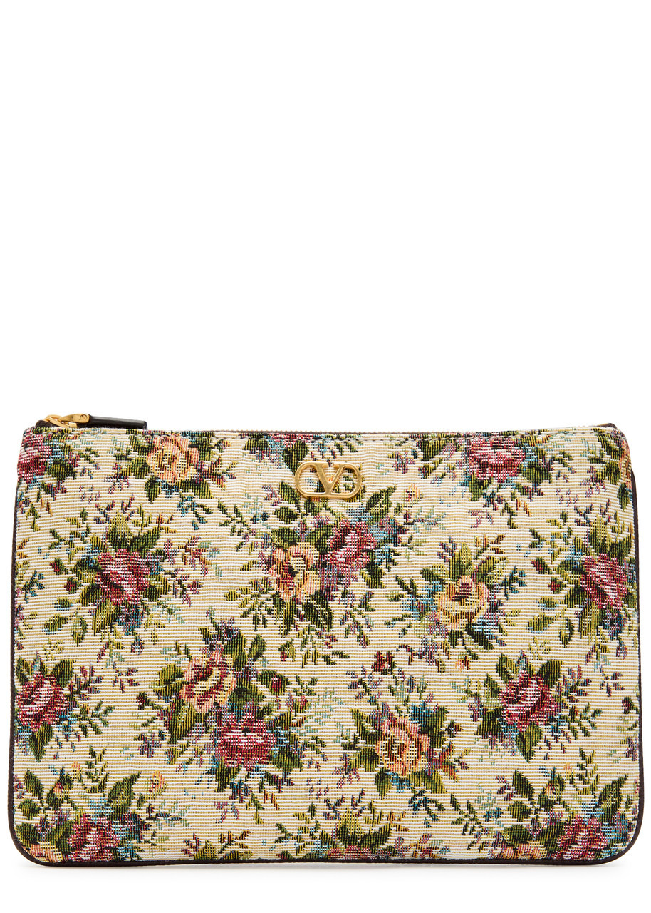 Info & Care Valentino Garavani woven pouch Floral jacquard, designer plaque, leather trim, three internal card slots, fully lined Zip fastening across top Size & Fit Width: 9 inches/ 23cm Height: 6.5 inches/ 16.5cm Depth: 0.5 inches/ 1cm